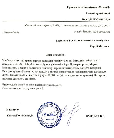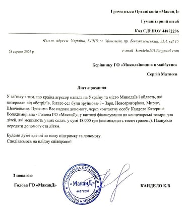 Для власників карток 4966 8360 0173 2750 (Отримувач ГО "МаканД" в особі Голови правління Кандело К.В.)